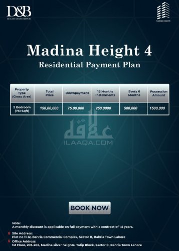 Two Bed Apartment For Sale on 1.5 years easy monthly installments. Summary: Location: Sector B - Umer Commercial, Bahria Town, Lahore Size: 731 Sq. Feet Purpose: For Sale Category: Apartment Price: On Call